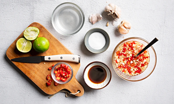 Tỏi & ớt tươi: Tỏi băm nhuyễn và ớt bỏ hạt giúp chén nước chấm trông tinh tế hơn.